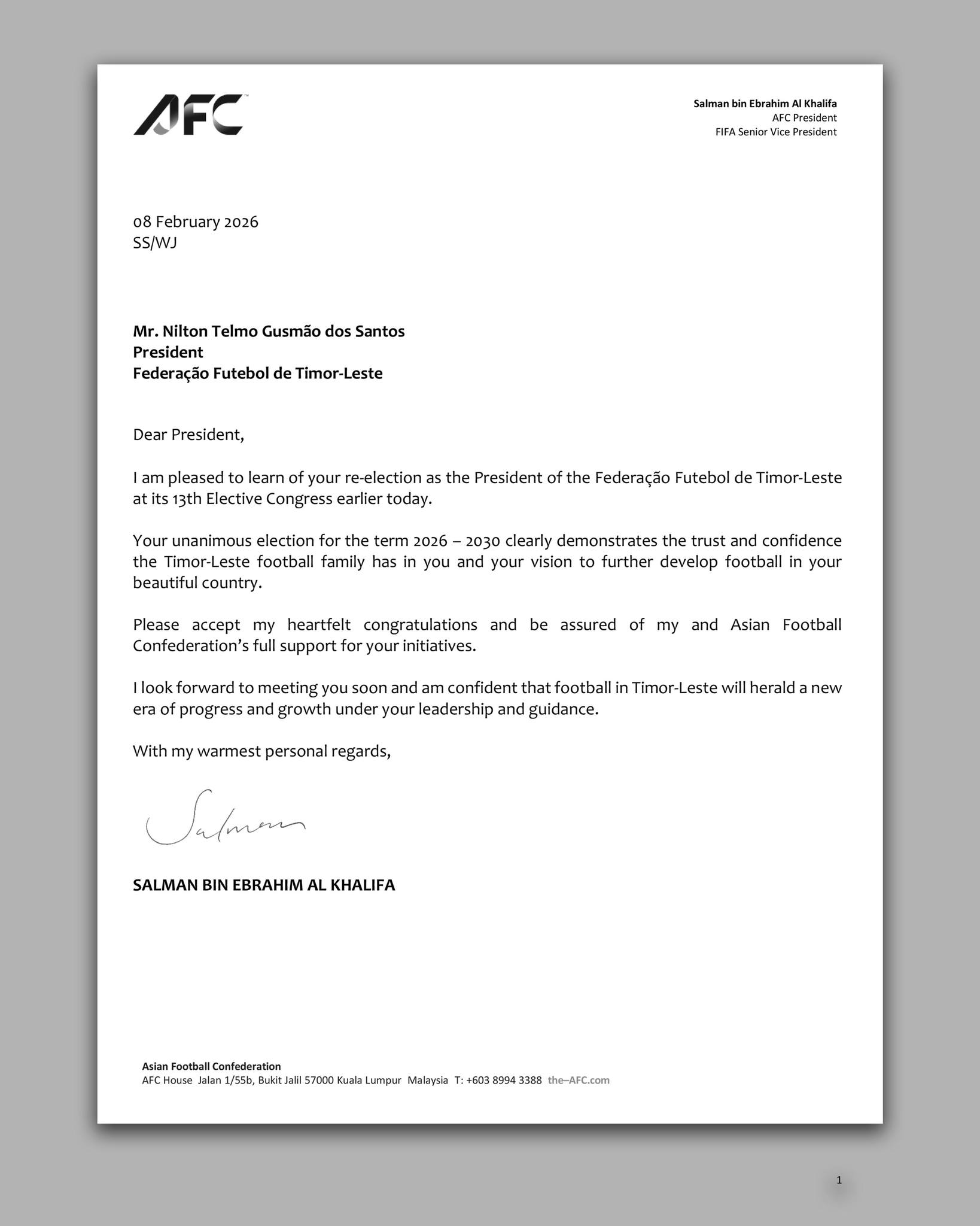 G—NEWS (DILI) — Prezidente Konfederasaun Futeból Aziátiku (AFC), Shaikh Salman bin Ebrahim Al Khalifa, fó parabéns ba Nilton Telmo Gusmão Dos Santos ba ninia re-eleisaun nu’udar Prezidente Federasaun Futeból Timor-Leste (FFTL) ba mandatu 2026–2030.